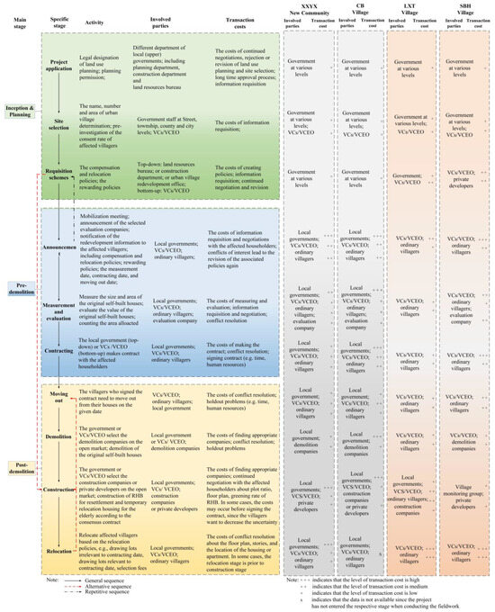 The UVRPs implemented in China have three stages: (1) inception and planning, (2) pre-demolition, and (3) post-demolition. Based on this generic redevelopment process for UVRPs established in the research framework, this study identified the partners, types, and sizes of transaction costs for each stage of the four comparative cases, as presented in Figure 3. Local governments were instrumental during the inception and planning phases, significantly influencing the initiation and structure of UVRPs. To mitigate the risks and uncertainties associated with redevelopment, transaction costs emerged from multiple rounds of negotiations among various government departments regarding urban planning. Additionally, efforts were needed for effective information dissemination to encourage villagers’ participation and to formulate suitable policies for seamless implementation. At this stage, the transaction costs were similar in the cases of XXYX New Community, CB Village, and LXT Village. In SBH Village, the project was implemented by inviting a private developer to fund the project, and the village committee was empowered to negotiate with the private developer directly about compensation and relocation policies. According to Singleton [44], multiple participating parties sharing power increases the transaction costs of collaboration. When village committees and private developers are in a cooperative relationship, both have the power to influence their counterparts’ decision-making. Achieving a consensual cooperation scheme increases transaction costs but decreases uncertainty. Therefore, the transaction costs at the requisition scheme stage under this type of institutional arrangement are high for both parties. Unlike the policies implemented in top-down institutional arrangements that have ‘policy continuity’ [43], the policies made in bottom-up institutional arrangements can vary as long as the content does not go against the guidelines stipulated by the local government. Such differences were reflected in the asset specificity of the transactions in the SBH Village redevelopment project. High asset specificity leads to high transaction costs in the policymaking stage.