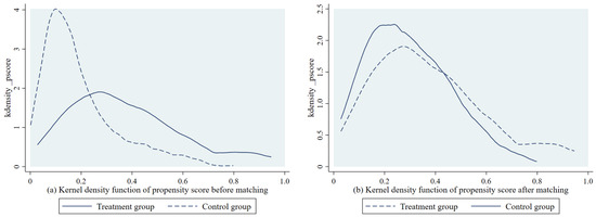 The common support region assumption is also known as the overlapping assumption, which assumes that the observed features in the treated group can also be observed in the control group. A wide common support region between the treated and control groups indicates a small sample loss, indicating a reasonable and effective matching result. The kernel density function composed of the propensity scores of farm households in the treatment and control groups before and after matching was used to test the common support region assumption. Figure 5 shows the results of the common support region test. Specifically, before matching (Figure 5a), there were differences in the kernel probability density between the treatment and control groups, and the common support region was narrow. After matching (Figure 5b), the kernel density of farm households in the treatment and control groups tended to be consistent, and the common support area between the two groups increased, which indicated that the selection bias in the samples had been eliminated. Given this, it can be concluded that it is necessary to match samples in the two groups. The matching results of this study through the k-nearest neighbor matching method (k = 4) met the requirements of the common support hypothesis.