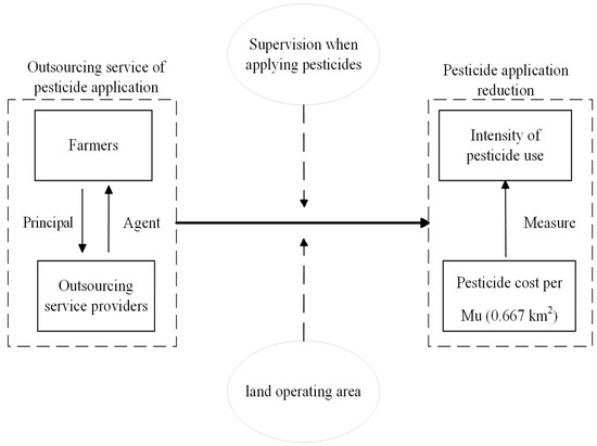 However, the existing research conclusions have a discrepancy between the impact of outsourcing service application and pesticide reduction. On the one hand, studies have found that implementing outsourcing services can decrease the use of pesticides and promote green production [18,19]. Specifically, scholars such as J. Li and Q. Li believe that outsourcing service providers can improve the efficiency of pesticide use through their professional knowledge, combined with mechanized operations [20,21]. They can also disseminate pesticide reduction technology within their service scope, so that more farmers can adopt pesticide reduction technology. Y. Zhang and Zhang have discovered that outsourcing service providers can leverage their financial advantages, give full play to their scale effect and professionalism, lead to choosing more efficient and environmentally friendly products when purchasing pesticides, and obtain bargaining power to promote the reduction of pesticide application by reducing the cost of pesticide application [18]. On the other hand, some studies have pointed out that the application of outsourcing services will increase the use of pesticides [22]. For example, J. Cai and Liu have found that most of China’s agricultural organizations are still in the era of small-scale peasant economy, and the plots are scattered, which is not conducive to the operation of outsourcing service providers and limits the efficiency and quality of pesticide application [23]. Gao and other scholars believe that China’s outsourcing service organizations are still in the primary stage, and there are problems such as insufficient professionalism and poor quality of operations, which make it difficult for farmers to trust the effect of outsourcing services, so most farmers have to apply pesticides repeatedly [24]. Generally, the root of the conflict in the existing research should be connected to the fact that most of the research does not consider factors such as the land management area of farmers and whether farmers take supervision measures during the process of pesticide application. This is because when farmers choose to apply pesticide outsourcing services, most of them will choose on-site supervision out of concern for their own interests and possible distrust of outsourcing service providers. These supervision measures require that outsourcing service providers ensure the quality of operations, which affects pesticide reduction. The area of land managed by farmers will also affect the implementation of pesticide reduction, because the larger the area of farmers’ operating land, the higher the cost of investment, meaning that farmers may repeatedly apply pesticide or increase the amount of pesticide to ensure their income. In addition, most studies have not considered the possible game and conflict of interests between outsourcing service providers and farmers, that is, the role of principal–agent theory in it. At present, only a few studies have taken the principal–agent theory into consideration to analyze the demand relationship and conflict of interest between outsourcing service providers and farmers to research the impact between the application of outsourcing services and the intensity of pesticide application [25]. Although the use of the principal–agent theory can more scientifically analyze the effects of outsourcing services on diminishing pesticides in the application process, such research is still relatively few, and few consider the moderating effect of factors such as farmers’ land management area and whether farmers supervise the outsourcing service process. In addition, most of the existing studies only focus on local regions, lack of empirical research using large sample survey data, and some of the existing studies do not deal with endogenous problems, meaning that conclusions and policy implications may deviate from reality [25,26].