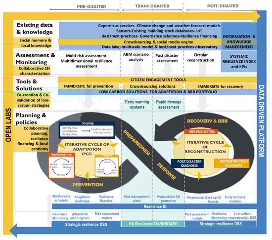 It follows that a framework for urban heritage resilience needs to increase the robustness of the urban heritage system as well as reduce the time this system needs to recover and be restored, both under slow-onset stresses and sudden-onset disasters. Thus, it becomes evident that an urban heritage framework should combine an adaptation/prevention/preparedness cycle (as in climate change adaptation) and a response/recovery cycle (as in disaster risk management). To make such a framework operational, it requires the integration of suitable methods, tools, and strategies that positively impact urban heritage resilience in different phases of the cycles and consistently consider the different resilience dimensions.
