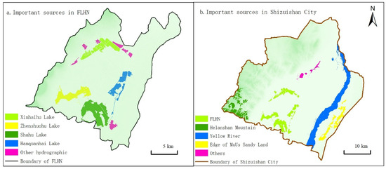 Considering both their intrinsic significance and mutual landscape connectivity, the important sources of the FLHN and the prefecture-level city of Shizuishan were obtained by integrating the sources from each scale (Figure 3). There were 19 important sources in the FLHN, encompassing an area of 105.07 km2, which accounts for 15.0% of the four lakes and their tributaries. At the same time, there were 41 important sources across the entire extent of the prefecture-level city of Shizuishan, covering an area of 433.10 km2, which accounts for 8.9% of the entire region. It contained four source groups: the FLHN, the Helanshan Mountain Nature Reserve, the main stream of the Yellow River, and the wind-sheltering and sand-fixing forest belt on the edge of the Mu Us Desert. The FLHN was located in the intersection of the other three source groups.