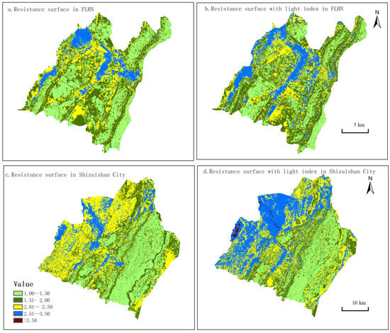 The landscape resistance surfaces at the level of the FLHN and the prefecture-level city of Shizuishan were obtained using identical factors and weights, respectively (Figure 4). At the FLHN level, the resistance values for most of factors were lower or low, except for the NDVI, which exhibited a significant percentage for high and higher. The comprehensive resistance surface was combined with the factors in equal weight and divided into five ranks based on natural breaks. The ratios of zones with lower, low, medium, and high ranks were 30.6%, 36.1%, 21.6%, and 11.8%, while zones with higher ranking were nearly absent. The result showed that it was feasible to construct and optimize the UGI network. In addition, we should be more focused on reflecting the contradiction between human activities and landscape restoration. The zones with high and higher resistance values were mainly concentrated in central urban and surrounding areas, which were affected by impermeable ground and traffic. At the level of the prefectural city of Shizuishan, zones with higher resistance values were primarily located in high-elevation areas in Helanshan Mountain Natural Reserve and distributed in the regions with little vegetation in the Mu Us Desert. The zones with higher resistance values were found to be adjacent to urban built-up areas and traffic routes as determined by incorporating the nighttime light index, also indicating that human activities have had a significant impact on landscape stability.