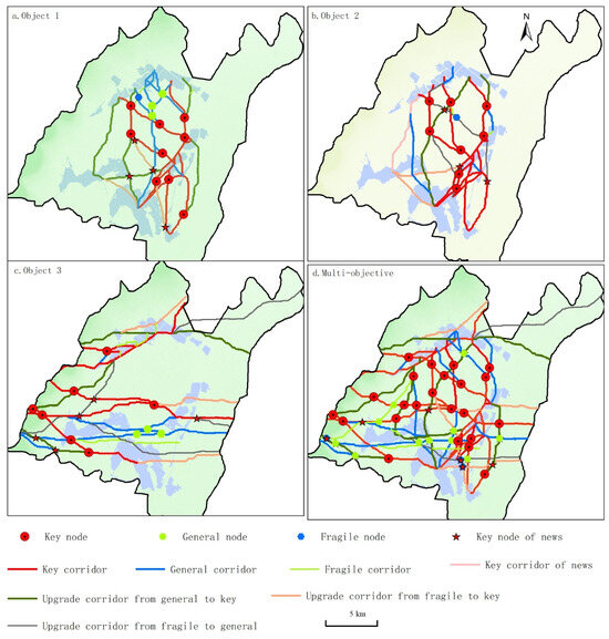 Objective 1: optimizing the internal structure of the FLHN. We extracted corridors and nodes at the FLHN level (Figure 5a). Six key corridors with a length of 83.18 km, six general corridors with a length of 121.90 km, and two fragile corridors with a length of 32.92 km were extracted, and eight key nodes, five general nodes, and four fragile nodes were also extracted. The key corridors were located in the east of the FLHN, establishing a sequential connection between Xinghaihu Lake, Hanquanhai Lake, and Shahu Lake. At the same time, the general corridors connected Xinghaihu Lake and Zhenshuo Lake via irrigational canals and connected Xinghaihu Lake and Shahu Lake via green belts along roads. The key nodes were associated with the key corridors, making the Hanquanhai Lake the axis in the FLHN. In order to optimize the internal structure of the FLHN, we needed to upgrade four general corridors, turn two fragile corridors into key corridors corresponding to a length of 86.91 km, and incorporate four key nodes from the existing general nodes. There were 10 important sources that were connected by key corridors, an increase from the value of only 7 before optimization. The new key nodes were situated at the intersection of key corridors between the southwest of Xinghaihu Lake and the southeast of Shahu Lake, serving as the stepping stones for species diffusion. The optimization of the UGI network not only established direct connections between Zhenshuo Lake and other lakes but also enhanced connectivity between Xinghaihu Lake and Shahu Lake. Furthermore, this approach was employed to improve overall efficiency in the western region of the FLHN.