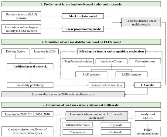 In this research, two scenarios, BAU and LCES, are first set up, and a Markov chain and linear programming model are used for land-use demand prediction. The second step involves simulating the space patterns of land-use alteration across various scenarios using the FLUS model. The third phase involves estimating and analyzing carbon emissions of land use under muti-scales, including urban agglomerations, cities, counties, and 3 × 3 kmgrids, using the carbon emission coefficient method (Figure 2).