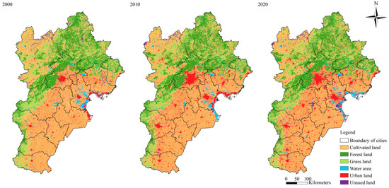 Beijing, the capital of China, is rich in forest land resources, with more than 45% of the overall area of forested land, predominantly located in the mountainous regions in the northwestern part of the city. From 2000 to 2020, Beijing’s urban land area expanded and subsequently fell, with an overall increasing tendency. In 2000, 2010, and 2020, Beijing’s urban land area was 13.68%, 23.41%, and 21.71%, respectively. Tianjin is rich in cultivated land and water areas, cultivated land constitutes roughly 51% of the entire area, and water area comprises around 13%, predominantly situated in the eastern coastal regions, major reservoirs, and river systems. In Tianjin, the area under cultivation decreased while the area under urbanization increased between 2000 and 2020, with the proportion rising from 15.58% to 26.46%. The primary land-use categories in Hebei Province are cultivated land, forest land, and grassland. Cultivated land, mostly in the southeast of the province, makes up more than 48% of the province’s entire area. Forest land accounts for more than 20% of the land and grassland for more than 17%, and they are mostly found in the mountainous regions of the northwest. In Hebei Province, the area under cultivation diminished while the area under urbanization expanded between 2000 and 2020, with the percentage of urban land rising from 7.18% to 11.13%.