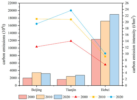 At the urban agglomeration scale, historical land-use carbon emissions have increased dramatically, from 15,971.28 × 104 tons in 2000 to 24,925.72 × 104 tons in 2020. However, compared to 2000 to 2010, there has been a notable deceleration in the increased rate of carbon emissions of land utilization between 2010 and 2020. Between 2000 and 2020, Beijing’s land-use carbon emissions and intensity increased initially before declining, whereas Tianjin and Hebei Province both continued to climb (Figure 5).