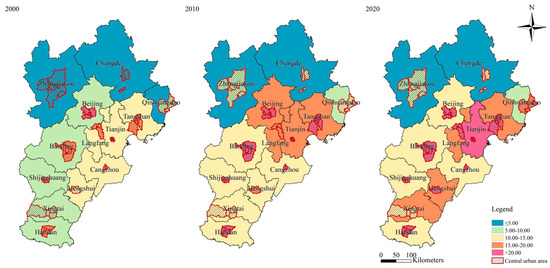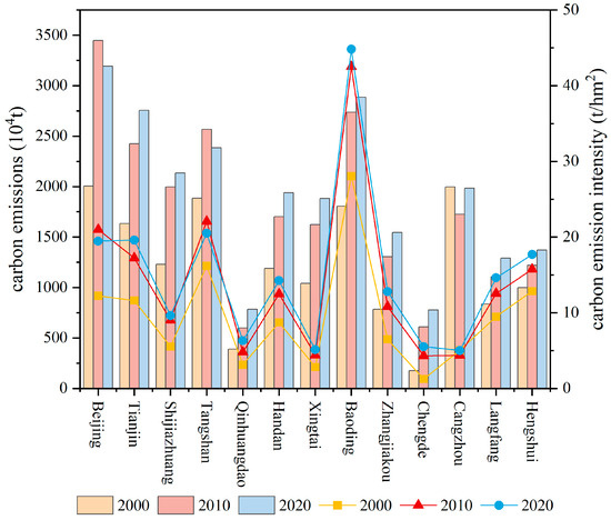 At the city scale, between 2000 and 2020, carbon emissions from land utilization in most cities increased, and only one city, Cangzhou, showed a small reduction in land-use carbon emissions (Figure 6). Cities exhibiting larger carbon emission intensity (t/hm2) were centered in the central urban areas of most cities in 2000, in the central cluster in 2010, and in the central cluster and the southern cluster in 2020 (Figure 7). We also investigated the connection between carbon intensity and whether a region is a central urban area or not to elucidate the characteristics of carbon intensity across different areas. As shown in Figure 7, except for Xingtai, the carbon emission intensity in the central urban area exceeds that of the non-central urban area in all other cities. Therefore, measures for zonal land-use optimization should be designed to reduce carbon emissions.