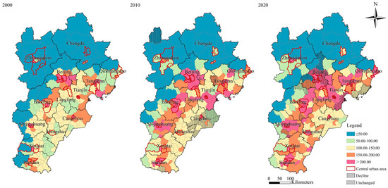 At the county scale, counties with greater carbon intensity (t/hm2) in 2000 were dispersed near the central urban areas within the south-central cities. In 2010, they were concentrated around the “Beijing-Tianjin”, “Beijing-Longfang-Baoding-Shijiazhuang-Handan”, and “Zhangjiakou-Beijing-Tangshan-Qinhuangdao” development axes. In 2020, both the carbon emission intensity and the range of higher intensities increased near the development axis (Figure 8). From 2000 to 2020, most counties show an upward trend in land-use carbon emission intensity. Counties with decreasing or unchanged land-use carbon emission intensity are concentrated in Cangzhou City between 2000 and 2010, while from 2010 to 2020, such counties are primarily found in Beijing and the coastal regions of Tianjin and Tangshan City.