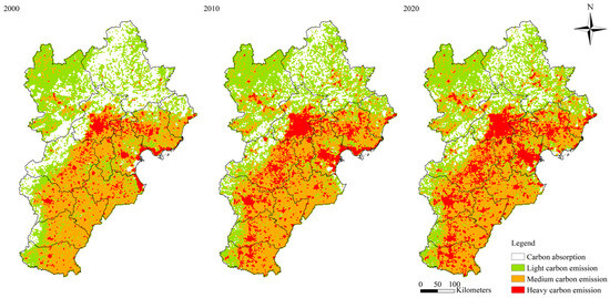 At the 3 × 3 km grid scale, carbon emissions from land utilization could be categorized into four kinds: carbon sequestration (≤0 tons), light carbon emissions (0–5,000 tons), medium carbon emissions (5,000–20,000 tons), and heavy carbon emissions (≥20,000 tons) (Figure 9). Between 2000 and 2020, in total, the area of carbon sequestration areas decreases significantly, the area of heavy carbon emission areas increases significantly, and the regions of light and medium carbon emissions remain basically stable. In terms of transformation trend, there is a stepped transformation trend, i.e., the light carbon emission area replaces the carbon sequestration area, the medium carbon emission area replaces the light carbon emission area, and the heavy carbon emission area replaces the medium carbon emission area. Regarding spatial distribution, heavy carbon emission areas are constantly spreading to the periphery with the central urban areas and the development axis as the center, but the area of heavy carbon emission areas within coastal regions has decreased.