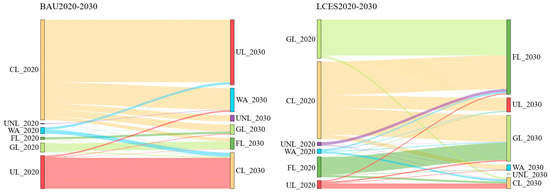 The land-use requirements for the BAU and LCES scenarios are shown in Table 5. Compared with 2020, cultivated land in both scenarios in 2030 shows a significant declining tendency (Figure 10), and forest land, grassland, water area, and urban land all show a growing tendency. The BAU scenario exhibits the most prominent shift of cultivated land toward urban land (Figure 11). The LCES scenario shows the most notable transfer of cultivated land into forest land and grassland. The rise in forest land and the fall in the transformation of cultivated land to urban land are the primary distinctions between the LCES scenario and the BAU scenario. The interface between cultivated and urban land is where the two scenarios’ spatial differences are most obvious.