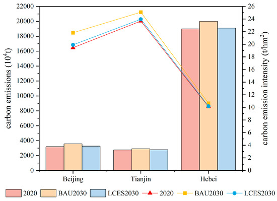 At the urban agglomeration scale, both land-use carbon emissions and growth rate in 2030 in the LCES scenario are significantly smaller than those under the BAU scenario, demonstrating the efficacy of the LCES scenario in reducing carbon emissions from land utilization. According to the BAU scenario and the LCES scenario, the carbon emissions from land utilization in 2030 will be 26,485.40 × 104 tons and 25,146.87 × 104 tons, respectively. In the LCES scenario, Beijing, Tianjin, and Hebei have less carbon emissions from land utilization and intensities compared to the BAU scenario (Figure 12).