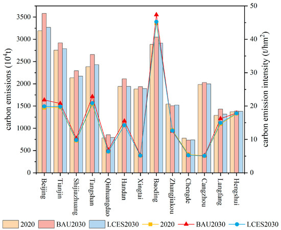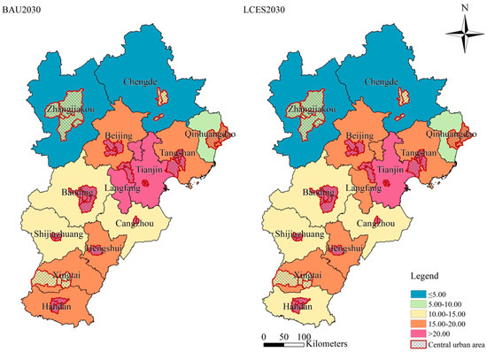 At the city level, in the LCES scenario, carbon emissions of land utilization are reduced compared to the BAU scenario for all 11 cities except Chengde and Zhangjiakou (Figure 13). The cities with larger carbon emission intensities (t/hm2) in both scenarios continue the 2020 trend and are concentrated in the central and southern cities (Figure 14). However, both the carbon emission intensity and the range of higher intensities are larger in the BAU scenario than in the LCES scenario. All cities, except Xingtai, have central urban areas with higher carbon emission intensities than non-central urban areas in both scenarios.