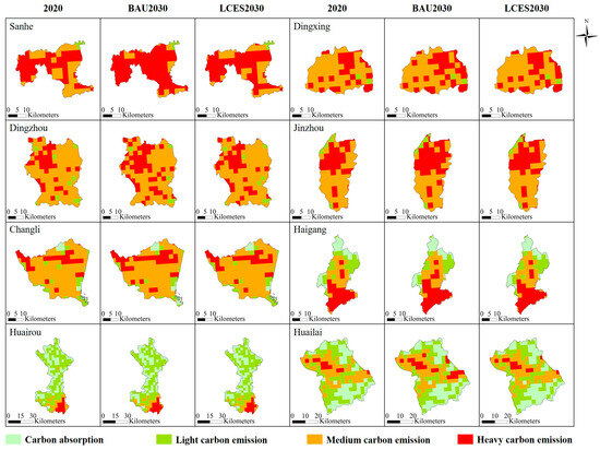 We identified two representative counties in each of the four types of functional areas of the BTH region—the central core functional area, the southern functional expansion area, the eastern coastal development area, and the northwestern ecological conservation area [65,66]—and analyzed the detailed differences in land-use carbon emissions between 2020 and 2030 under two scenarios (Figure 17). The representative counties in the southern functional expansion area and the central core functional area have less heavy carbon emission zones in the LCES scenario compared to the BAU scenario, as can be shown. The representative counties in the eastern coastal development area show little difference between the two scenarios. Relative to the BAU scenario, the representative counties in the northwestern ecological conservation area have bigger carbon sequestration zones under the LCES scenario. Land-use optimization by zoning can therefore be done concerning the LCES scenario.