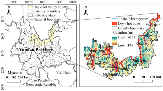 The study area is the dry–hot valley region of the Jinsha River in Yunnan Province, situated between 25.2° N and 28.5° N, 100.3° E and 103.9° E. It encompasses Heqing, Yuanmou, Yongshan, and other counties and districts, covering a land area of approximately 46,246 km2 (Figure 1). Characterized by high mountains and deep valleys with evident vertical zonality, the study area exhibits unique climatic features that allow it to be classified into two distinct zones: the dry–hot valley zone and the non-dry hot valley zone [23]. The dry–hot valley has a hot and arid climate, with a significant disparity in precipitation between the dry and rainy seasons. The dominant vegetation is savanna shrub and grass with low coverage and productivity [25]. The soil primarily consists of dry red soil and vertisol with poor soil and water conservation capabilities. Today, it has been identified as one of the three regions with the most severe soil erosion in China.