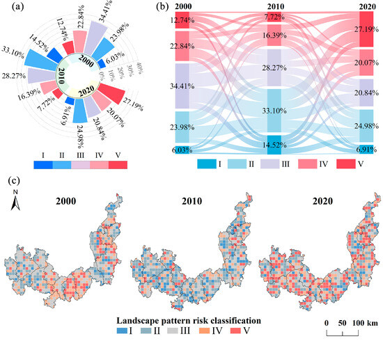 Spatial and temporal variations in landscape pattern risk from 2000 to 2020. (a) Area proportion of in different levels of landscape pattern risk areas; (b) Area proportion shift of landscape pattern risk areas; (c) Spatial distribution of the landscape pattern risk. Meaning of the labels in the figure: I (Very low risk level), II (Low risk level), III (Medium risk level), IV (High risk level), V (Very high risk level).