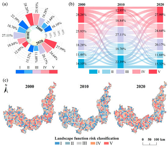 Spatial and temporal variations in landscape function risk from 2000 to 2020. (a) Area proportion of in different levels of landscape function risk areas; (b) Area proportion shift of landscape function risk areas; (c) Spatial distribution of the landscape function risk. Meaning of the labels in the figure: I (Very low risk level), II (Low risk level), III (Medium risk level), IV (High risk level), V (Very high risk level).