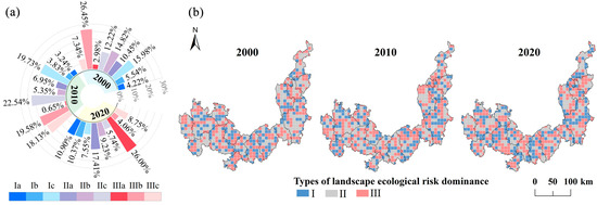 Spatial and temporal variations in dominant types of landscape ecological risk from 2000 to 2020. (a) Area proportion of dominant landscape ecological risk types; (b) Spatial distribution of dominant types of landscape ecological risk. Meaning of the labels in the figure: I (The level of landscape pattern risk is greater than that of function risk), II (The risk level of landscape pattern is less than that of function risk), III (The level of landscape pattern risk is equal to the level of functional risk), Ia (High-level pattern risk and Low-level function risk), Ib (High-level pattern risk and Medium-level function risk), Ic (Medium-level pattern risk and Low-level function risk), IIa (Low-level pattern risk and High-level function risk), IIb (Medium-level pattern risk and High-level function risk), IIc (Low-level pattern risk and Medium-level function risk), IIIa (High-level pattern risk and High-level function risk), IIIb (Medium-level pattern risk and Medium-level function risk), IIIc (Low-level pattern risk and Low-level function risk).