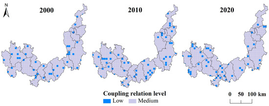 The coupling degree values of the LPRI and the LFRI in 2000, 2010, and 2020 were 0.442, 0.396, and 0.440, respectively, which remained stable at the medium level, indicating a general lack of harmony between the two types of ecological risks over 20 years. The area proportion of regions with medium coupling degree was 93.40%, 91.43%, and 92.36% in the corresponding years, with very few areas exhibiting a low coupling degree. In most areas, a stable and dominant medium coupling relationship was observed, with only a small area exhibiting low coupling degree values that are widely dispersed (Figure 5).