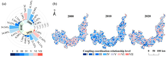 Spatial and temporal variations of the coupling coordination level of landscape pattern risk and function risk from 2000 to 2020. (a) Regional area proportion of different landscape pattern risk and function risk coupling coordination level; (b) Spatial distribution of coupling coordination level between landscape pattern and function risk. Meaning of the labels in the figure: I (Very high incoordination), II (High incoordination), III (Medium incoordination), IV (Low incoordination), V (Very low incoordination), VI (Very low coordination), VII (Low coordination).