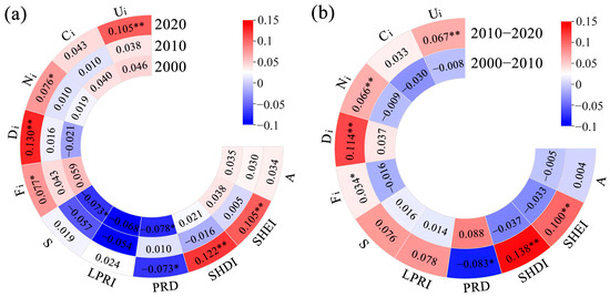 The correlation and dynamic changes between landscape pattern indices and landscape functional risks. (a) Correlation between landscape pattern indices and landscape function risk. * indicates a Pearson correlation significance level of 5%, and ** indicates a Pearson correlation significance level of 1%. (b) The alteration of the correlation coefficient between landscape pattern index and landscape functional risk. * indicates a significant change in the correlation coefficient from the previous year, and ** indicates a very significant change in the correlation coefficient from the previous year. Meaning of the abbreviations in the figure: Ui (landscape disturbance index), Ci (landscape fragmentation index), Ni (landscape separation index), Di (landscape dominance index), Fi (landscape fractal dimension index), S (landscape sensitivity index), LPRI (landscape pattern risk index), PRD (patch richness density), SHDI (Shannon’s diversity index), SHEI (Shannon’s evenness index), A (landscape pattern adaptive risk index).
