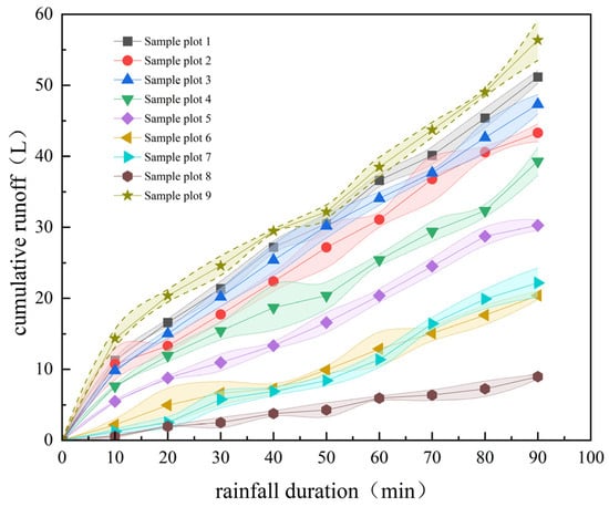 As can be seen from Figure 1, there is a significant difference in slope runoff volume under different plant communities and biological crust symbiosis patterns. The slope runoff volumes are in the order of Plot 8, Plot 6, Plot 7, Plot 5, Plot 4, Plot 2, Plot 3, Plot 1, Plot 9. The slope runoff volume is the smallest on bare land (Plot 9); the slope under the treatment of A. argyi, A. selengensis, and C. mongolicum communities with biological crust symbiosis (Plot 8) has the largest runoff volume. As the rainfall duration increases, the cumulative runoff volume on each slope continues to grow. Ranking the slope cumulative runoff volume by size, the treatment under different plant communities and biological crust symbiosis patterns also shows Plot 8, Plot 6, Plot 7, Plot 5, Plot 4, Plot 2, Plot 3, Plot 1, Plot 9. The cumulative runoff volume on the bare slope (Plot 9) is 6.29 times that of the slope under the treatment of A. argyi, A. selengensis, and C. mongolicum communities with biological crust symbiosis (Plot 8). Under a rainfall intensity of 90 mm·h−1, the A. argyi, A. selengensis, and C. mongolicum. communities with 30% mixed crust symbiosis pattern have the most significant effect on reducing runoff on slopes.