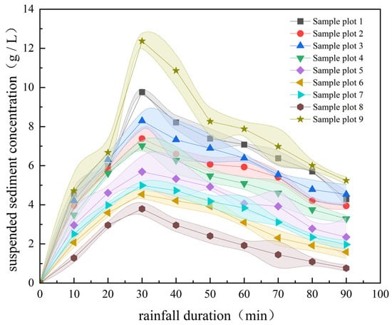 As can be seen from Figure 2, under a rainfall intensity of 90 mm·h−1, there is a significant difference in the sediment concentration of runoff on slopes under different plant communities and biological crust symbiosis patterns, with the sediment concentration decreasing as the type of plant community and the coverage of biological crust increase. Throughout the entire rainfall process, the sediment concentration in the runoff on each slope fluctuates significantly, increasing before 40 min and decreasing after 40 min. The sediment concentrations from smallest to largest are Plot 8, Plot 6, Plot 7, Plot 5, Plot 4, Plot 2, Plot 3, Plot 1, and Plot 9 (bare land). This indicates that different plant communities and biological crust symbiosis patterns can effectively reduce the intensity of slope erosion, decrease the sediment concentration in runoff, and retain water and soil. The effect is most significant with A. argyi, A. selengensis, and C. mongolicum. combined with 30% mixed crust.