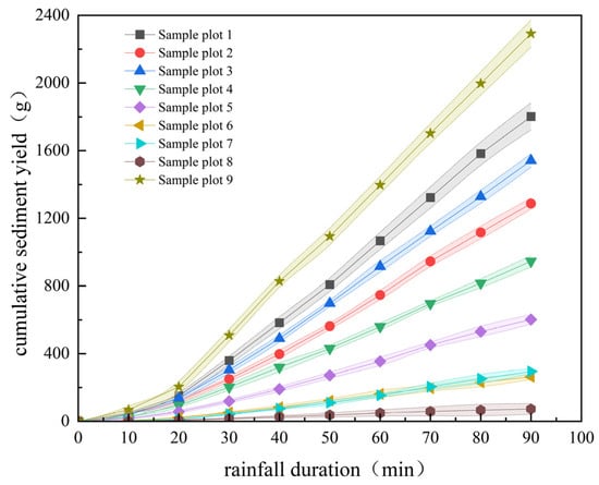 Throughout the entire rainfall process, the cumulative sediment yield under both single plant community and biological crust symbiosis pattern treatments and multiple plant community and biological crust symbiosis pattern treatments is lower than that of the bare land control. As the variety of plant communities and the coverage of biological crust increase, the cumulative sediment amount gradually decreases (Figure 3). The cumulative sediment yield on the nine slopes is in the order of Plot 8, Plot 6, Plot 7, Plot 5, Plot 4, Plot 2, Plot 3, Plot 1, Plot 9, with the largest cumulative sediment yield on the bare land (Plot 9). The cumulative sediment yield under the treatment of A. argyi, A. selengensis, and C. mongolicum. communities with biological crust symbiosis (Plot 8) is relatively low. By the end of the rainfall, the cumulative sediment yield on the bare slope (Plot 9) is 31.5 times that of the slope under the treatment of A. argyi, A. selengensis, and C. mongolicum communities with biological crust symbiosis (Plot 8). After the completion of the simulated rainfall experiment, we compared the cumulative sediment yield of different treatment plots (Plots 1–8) with that of the bare land treatment (Plot 9). The results show that: For Plot 1, the cumulative sediment yield decreased by 21.4%. For Plot 2, the cumulative sediment yield decreased by 43.85%. For Plot 3, the cumulative sediment yield decreased by 32.73%. For Plot 4, the cumulative sediment yield decreased by 58.74%. For Plot 5, the cumulative sediment yield decreased by 73.75%. For Plot 6, the cumulative sediment yield decreased by 88.57%. For Plot 7, the cumulative sediment yield decreased by 87.15%. For Plot 8, the cumulative sediment yield decreased by 96.82%. This indicates that the root structures of different plant communities can penetrate deep into the soil, increasing soil stability and reducing the sediment concentration in runoff. The coverage of biological crust, on top of the plant communities, more effectively weakens the intensity of slope erosion, slows down the runoff velocity, and reduces the sediment concentration in runoff. Under a rainfall intensity of 90 mm·h−1, the A. argyi, A. selengensis, and C. mongolicum. communities with 30% mixed crust symbiosis pattern coverage have a significant effect on reducing soil erosion and can significantly affect the slope sediment yield process.