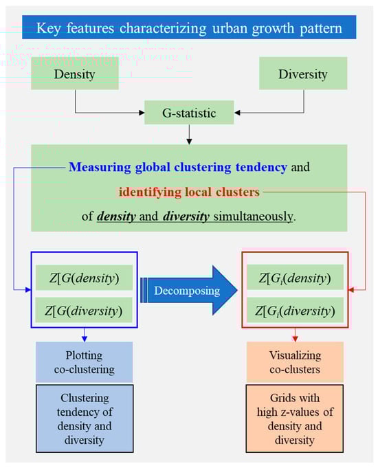 To address the limitation, the current study introduces a novel framework that employs the G-statistic, a widely recognized spatial statistical tool, to measure the co-clustering tendency of building density and diversity. The G-statistic is particularly effective in identifying the spatial clustering tendency and pinpointing local hotspots of high density and diversity. By applying this method to subareas in South Korea, this study assesses whether high-density and high-diversity regions tend to spatially coincide, suggesting the presence of co-clustering.