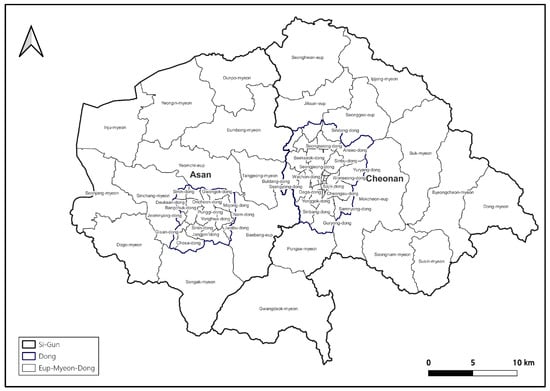 Figure 2 shows the administrative boundaries of the entire study region in the hierarchy. The boundaries of districts and towns within Cheonan and Asan were delineated using census administrative boundary shapefiles provided by Statistics Korea through the Statistical Geographic Information Service (SGIS). In the figure, ‘Si-Gun’ indicates a city-town, drawn in a thick outline. ‘Dong’ is the administrative unit comprising a city area with a relatively high population density. Since ‘Dong’ is a highly populated area, the size is small relative to the town. It is shown that small-sized ‘Dong’ units are concentrated around the west boundary of the city of Cheonan and in the middle part of Asan.