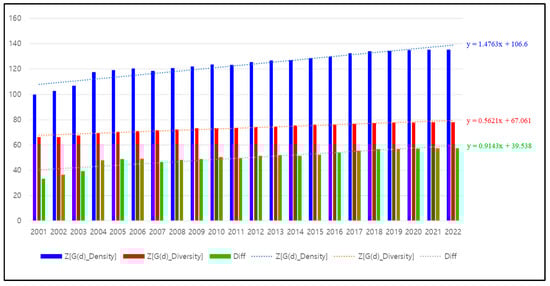 ). The z-value quantifying the spatial clustering tendency of density has increased by 1.4763 per year and that of diversity by 0.5621 per year.