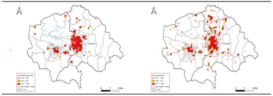 In summary, high values of occupy the entire study region for period dominantly, where the co-clustering tendency tends to be quite strong. If this type of spatial pattern has continued, it indicates that diversity in building types has concurrently appeared, aligning with building density in the process of urban growth. Again, is a global index derived from the overlapped results of for density and diverstiy. Thus, it is informative to visualize the local clustering propensity in high density and high diversity in building locations on the map. In this respect, empirical results are presented with local images, demonstrating the urban growth pattern as well as the temporal change in the global spatial pattern of land use.