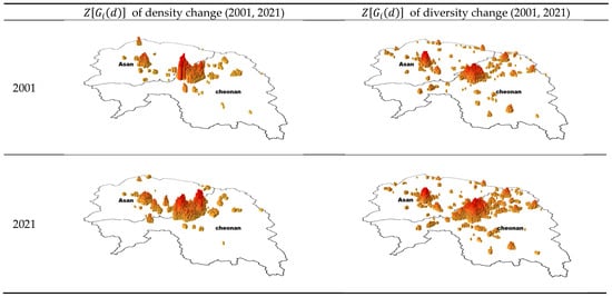 in density (left) and diversity (right) in 2001 and 2021, covering both cities. Red grids have expanded over time, centered around specific subregions: Munhwa-dong in Cheonan and Oncheon-dong in Asan. Those subregions correspond to old city centers in the two cities, inferring that both cities have grown from the old centers outward in a monocentric manner. In the southwest periphery of the red grid clusters of Cheonan, bordering the administrative boundary of Asan, is Cheonan-Asan station, which is one of the stations of high-speed trains (or Korean Train Express: KTX) running from Seoul to Busan. Since 2003, when the station opened, the adjacent local regions have expanded rapidly and strengthened the monocentric form from the proximal old city center. The tendency of expansion from the old center seems to have applied to Asan, too. Upon closer investigation, it becomes evident that both cities have developed into typical monocentric forms over the past two decades, with the highest values (red color) concentrated in the center and decreasing toward the periphery.