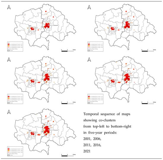 Figure 5. From the temporal maps showing co-clustered growth patterns, it seems the conurbation of the two cities is a possibility in the future.