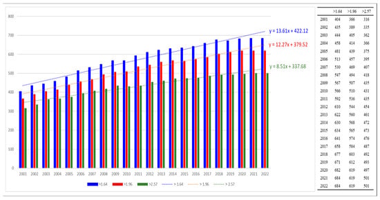 The green bar points to the number of overlapped grids with over 2.57. Similarly, red and blue bars denote the cases of over 1.96 and 1.64, respectively. Grids with the highest values in both variables increase over time by 8.51 per year. The increases in the number of grids with relatively lower values are estimated as 12.27 and 13.61, respectively, for over 1.96 and 1.64, while demonstrating upward trends, signifying that the study region has grown in both dimensions of density and diversity over the last two decades and implying that mixed land uses have prevailed in the monocentric urban spatial structure.