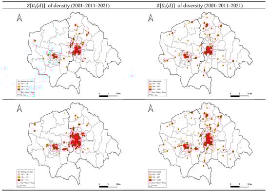In summary, high values of Z G i d occupy the entire study region for period t dominantly, where the co-clustering tendency tends to be quite strong. If this type of spatial pattern has continued, it indicates that diversity in building types has concurrently appeared, aligning with building density in the process of urban growth. Again, C C I t ( d ) is a global index derived from the overlapped results of Z G i d for density and diverstiy. Thus, it is informative to visualize the local clustering propensity in high density and high diversity in building locations on the map. In this respect, empirical results are presented with local images, demonstrating the urban growth pattern as well as the temporal change in the global spatial pattern of land use.