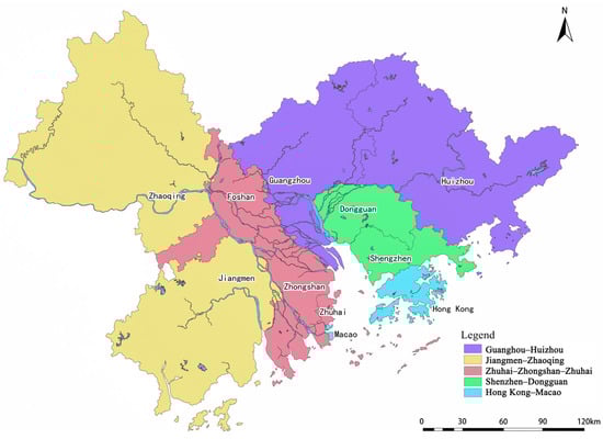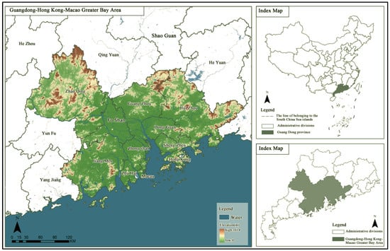 The scope of this article is the Guangdong–Hong Kong–Macao Greater Bay Area (GBA), which is shown in Figure 1. The GBA is located in the Pearl River Delta of Guangdong Province (21°25′ N~24°30′ N, 111°12′ E~115°35′ E), including Hong Kong Special Administrative Region, Macao Special Administrative Region, and the Guangdong Provincial Cities of Guangzhou, Shenzhen, Zhuhai, Foshan, Huizhou, Dongguan, Zhongshan, Jiangmen, and Zhaoqing, with a total area of 56,000 km2. With a total population of up to 86 million people, it is a typical high-density town cluster and high-density population area in the world; it is an important strategic space for the combination of the two trade circles of the Pacific Rim and the Indian Ocean Rim, and bears the important responsibility of leading the transfer of trade from the Pacific Rim to the Indian Ocean Rim. It is one of the largest and most economically powerful mega-city clusters in China [44,45].