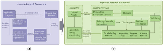 The relationship between human social development indicators and ESs: (a) Summary of previous research ideas; (b) Improved research framework.