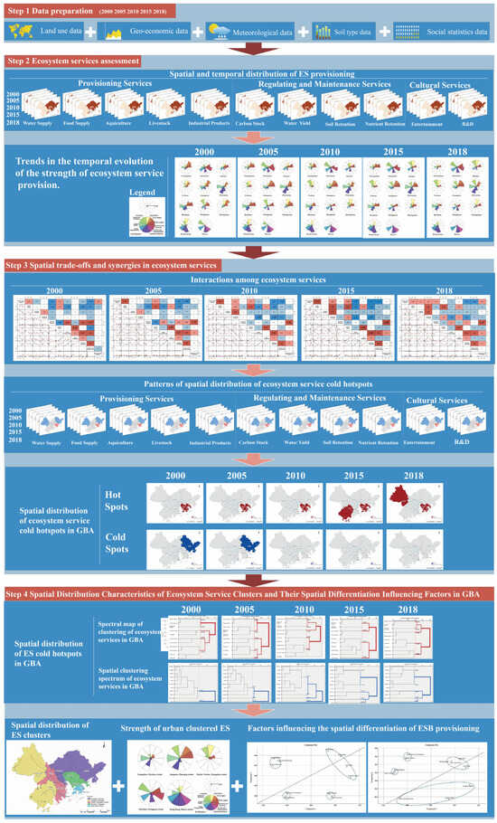 As a mega-urban agglomeration, the natural environment of the GBA urban agglomeration is subject to intense human interference. The main objective of our study was to investigate the trade-offs and synergistic relationships among the ecosystem service types in this mega-urban agglomeration to achieve sustainable regional human socio-economic development and ESs. This study refers to the research paper on ecosystem services in the Guangdong–Hong Kong–Macao Greater Bay Area [46,47,48,49,50]. Based on the relationship between human social development indicators and ESs, we scientifically assessed the relationships among 11 ESs in four categories: provisioning, regulation and supporting, and culture services. The improved research framework (Figure 1) was used to identify the ecosystem service bundles and their spatial and temporal evolution characteristics and provide a more scientific basis for the optimization of ecosystem service functions and management decisions in the region.