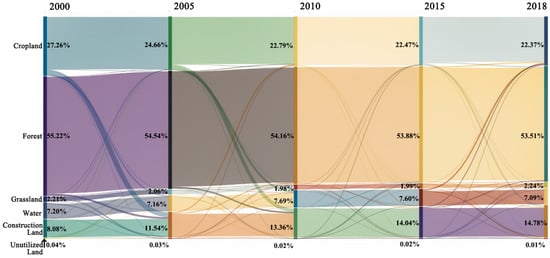 It helps to understand the ESs’ evolution by analyzing the GBA land use transfer from 2000 to 2018. Through the GBA land use transfer analysis map (Figure 4) and Table 3 for the last 20 years, it can be observed that in the comparison of each time period, the transferred area of cropland and forest land is the largest, while the transferred area of grassland and unutilized land is the smallest. It is clear that all types of human construction activities have been encroaching on cropland, forest land, and other natural environment land. Among the transferred lands, the construction land occupies the largest proportion, while the grassland, forest land, and unutilized land are the smallest. From 2015 to 2018, the increase in grassland area and the decrease in water area in the GBA were mainly due to rapid urbanization and land use change. The increase in grassland area was mainly due to the degradation of some forest land to grassland and the promotion of greening projects. The decrease in water area was due to the encroachment of wetlands and water areas by urban expansion, and the conversion of water bodies to other land types due to the increase in construction land. In addition, the adjustment of the ecosystem pattern also reflects the pressure of regional economic development on natural resources and the lack of ecological protection. Relevant studies have pointed out that this change has revealed to a certain extent the ecological and environmental challenges faced by the rapid development of the GBA [59,60,61]. See Tables S1–S4 for a table of land use transfers by period.
