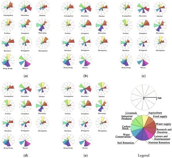 The GBA ecosystem services Rose Map; the length of the sector radius indicates the strength of the corresponding service supply: (a) Analysis of ecosystem service supply in 2000; (b) Analysis of ecosystem service supply in 2005; (c) Analysis of ecosystem service supply in 2010; (d) Analysis of ecosystem service supply in 2015; (e) Analysis of ecosystem service supply in 2018.