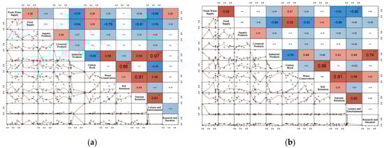 This study explored the combination and layout of 11 services selected from four ESs for 55 pairs of ESs. The results of the residual normal distribution test for the 55 pairs of ESs were normal. Pearson correlation analysis was conducted to analyze the relationship between the 55 pairs of ESs over different time periods to identify trade-offs or coordinated relationships between ESs. The results of the analysis through R-speak are shown in Figure 6.