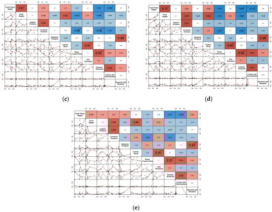 Pearson correlation between ESs of the GBA: (a) Correlation analysis among ecosystem services in 2000; (b) Correlation analysis among ecosystem services in 2000; (c) Correlation analysis among ecosystem services in 2005; (d) Correlation analysis among ecosystem services in 2010; (e) Correlation analysis among ecosystem services in 2018. In the figure, * indicates the significance of interactions between ecosystem services, * indicates weak significance, ** indicates moderate significance, and *** indicates high significance.