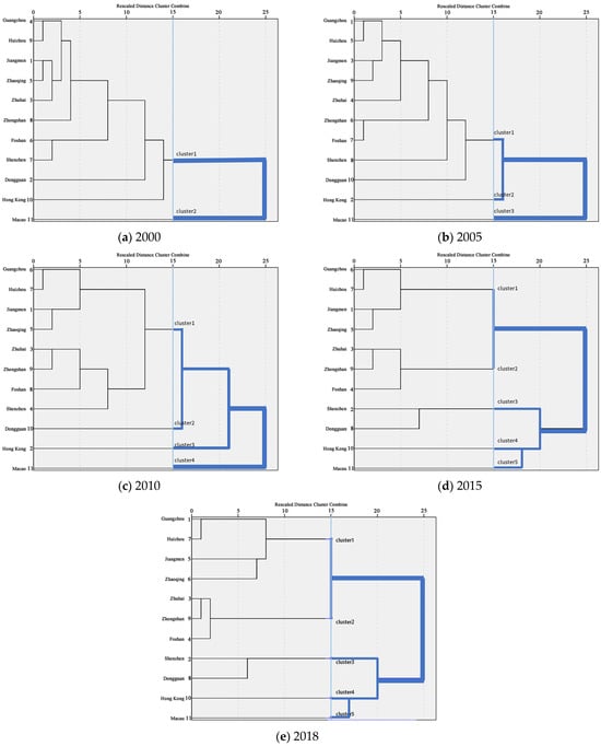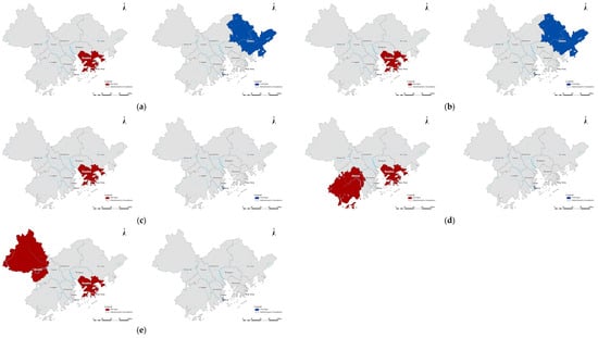 Clustering pedigree map of ESs of the GBA. (a) Spatial clustering pedigree map of the GBA in 2000; (b) Spatial clustering pedigree map of the GBA in 2005; (c) Spatial clustering pedigree map of the GBA in 2010; (d) Spatial clustering pedigree map of the GBA in 2015; (e) Spatial clustering pedigree map of the GBA in 2018.