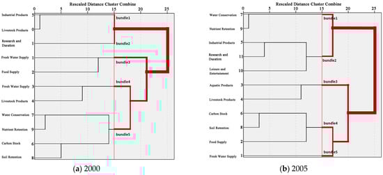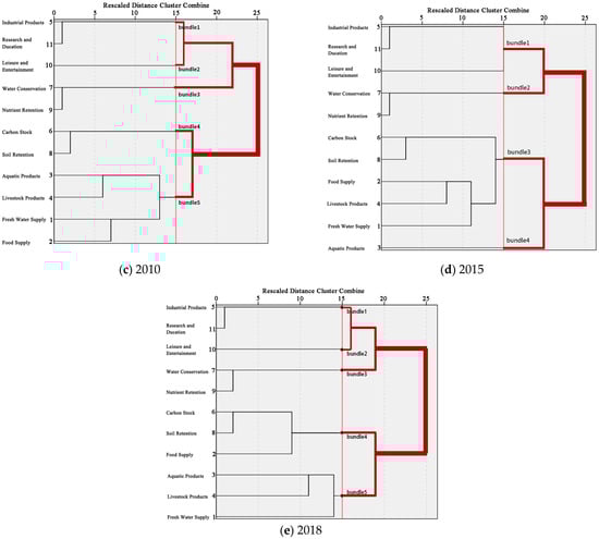 It is difficult to directly reflect the trade-offs or synergistic relationships between ESs by simply describing the distribution of hot or cold spot areas supplied by ESs at the municipal scale. The spatial distribution of ecosystem service bundles can be further researched based on the study of spatial trade-offs and synergistic relationships between ESs and spatial mapping relationships. The same or similar characteristic relationships among ESs can be explored to identify ecosystem service provisioning bundles that spatially provide the basis for effective ecosystem service management. Hierarchical clustering analysis was conducted by analyzing various types of ESs at different time periods (Figure 8). Ecosystems in different time periods exhibited different clustering characteristics. The clustering of ecosystem service bundles in different years of the GBA is shown in Table 4.