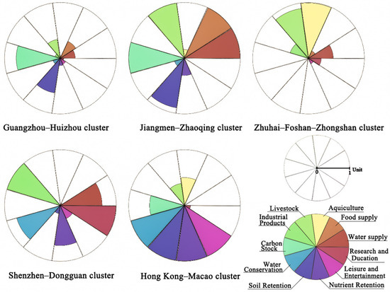 Principal component analysis was conducted on each ecosystem service in GBA in 2018 to clarify the main reasons affecting the divergence of ecosystem service bundles supply. The results showed that it could better explain the 11 ecosystem service factors of the current study, and the ESs such as livestock products, food supply, and carbon storage, which were mainly included in the first principal component, corresponded to the Jiangmen–Zhaoqing cluster, explaining 38.0% of the original variables. The second principal component mainly contained ESs such as freshwater supply, industrial products, and aquatic product supply, which corresponded to the clustering of Zhuhai–Foshan–Zhongshan, and explained 25.4% of the variance contribution. The third principal component mainly contained scientific research, education, and industrial products, which corresponded to the clustering of Shenzhen–Dongguan, and explained 18.2% of the variance contribution. The rest of the principal components had a variance contribution rate of less than 10%. The principal component equations showed certain trade-offs/synergies among the ESs in the same principal component (Figure 12); however, there were certain differences from the results of the trade-offs/synergies obtained using the Pearson correlation coefficient calculation. This, combined with the results from previous studies, indicated that ecosystem service bundles could be mapped to different spatial bundles.
