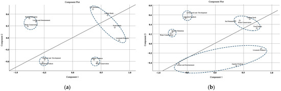 Principal component analysis factor loading plot. (a) Factor loading plots for principal component 1 and principal component 2; (b) Factor loading plots for principal component 1 and principal component 3.