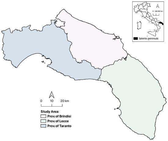 Study area represented by the Salento Peninsula in southern Italy, with the identification of the provinces of Brindisi, Lecce, and Taranto.