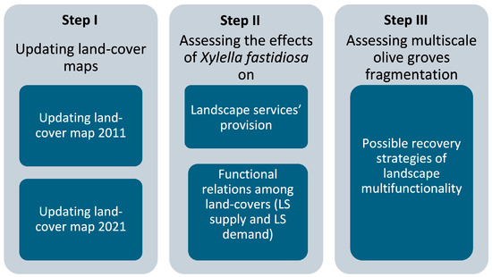 The methodology has been divided into 3 steps (Figure 2): (1) Updating land-cover maps in 2011 and in 2021; (2) Assessing the effects of Xylella fastidiosa on landscape service (LS) provision and on the functional relations among land covers acting as LS supply and LS demand; (3) Assessing the multiscale olive groves fragmentation to identify possible recovery strategies of landscape multifunctionality.