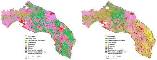 The land cover classes have been mapped in 2011 and in 2021. The mapping process in 2011 was carried out by simplifying the Corine land-cover map of the study area based on the ESA World Cover classification. In particular, the Corine land-cover map in 2011 was acquired from the Copernicus geo-database (https://land.copernicus.eu/en/products/corine-land-cover/clc-2012, accessed on 8 April 2024), which has a Minimum Mapping Unit (MMU) of 25 ha for areal elements. On the other side, the ESA land cover map of the study area in 2021 has been acquired from the ESA geo-database (https://worldcover2021.esa.int/, accessed on 8 April 2024) with 10 m resolution. The classification has been modified by including the “olive groves” class. Since an updated map of the olive trees that are actually still alive does not exist, the class “Tree cover” mapped by ESA in 2021 has been used since it includes different classes of forests and the residual olive groves. Therefore, through a topological elaboration in QGIS, it has been possible to extract what were still olive groves in 2021 from the class “Tree cover” by considering the map of olive groves in 2011. The homogenization of the classification has made both land-cover maps comparable and based on the following classes: