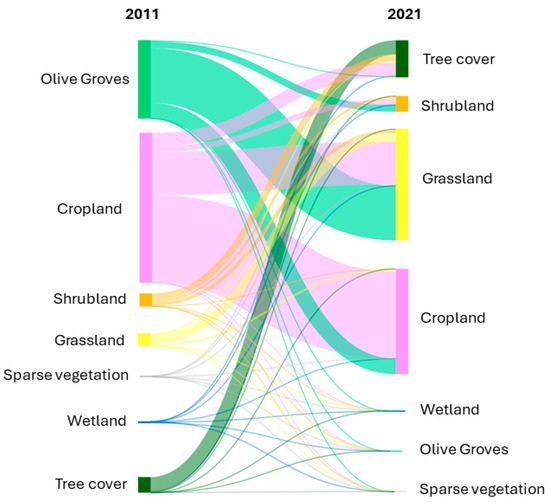 Sankey diagram of land-cover conversion from 2011 to 2021.